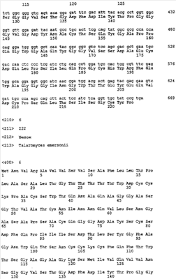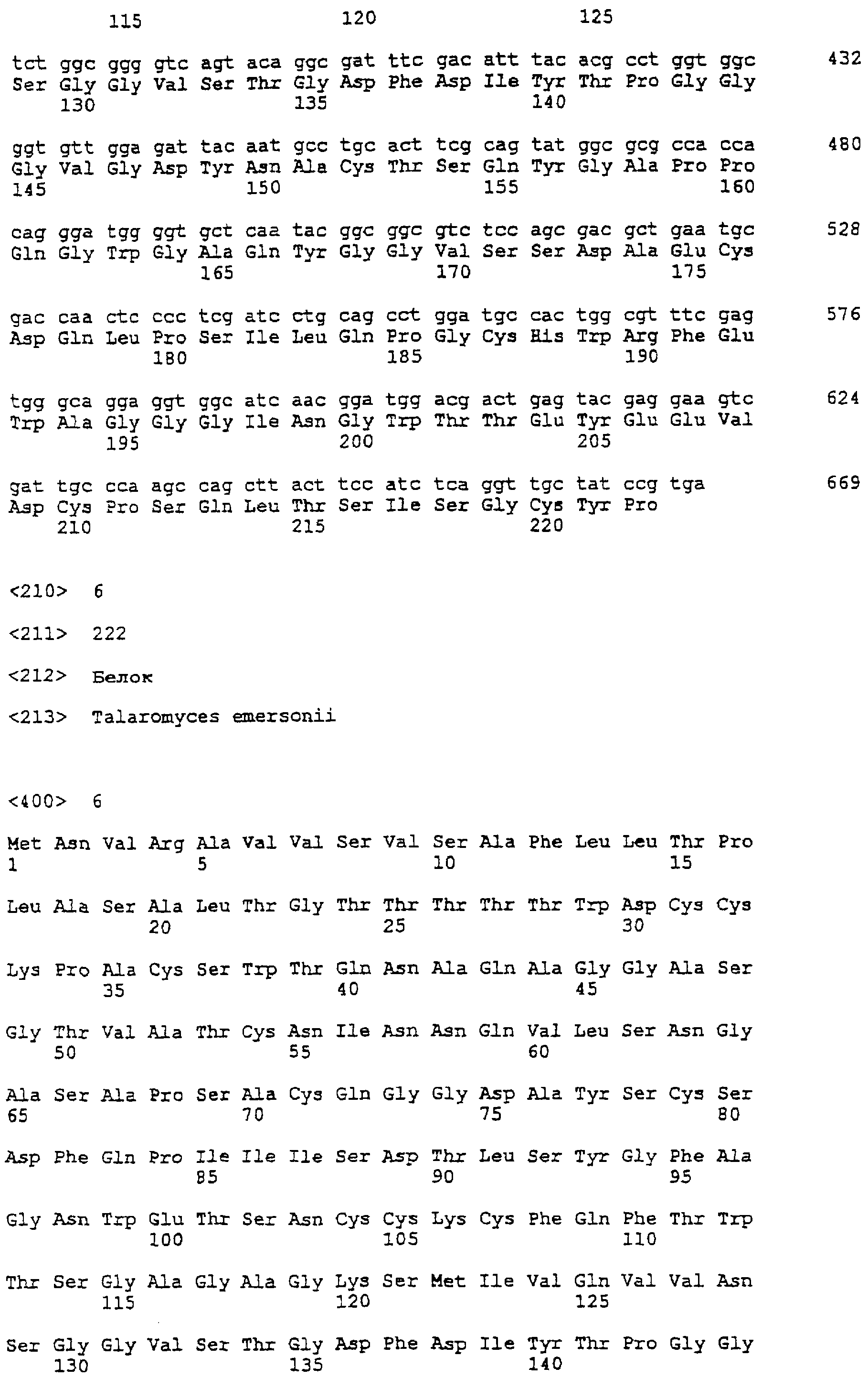Данное изобретение относится к новым ( Предпосылка изобретения Состав клеточной стенки растений сложен и изменчив. Полисахариды главным образом выявляют в форме длинных цепей целлюлозы (основного структурного компонента клеточной стенки растений), гемицеллюлозы (содержащей различные цепи Бета-глюкан (или более точно, (1 Основные различия существуют между однодольными (например, злаковые и травы) и двудольными (например, клевер, рапс и соя) и между семенами и вегетативными частями растения. Однодольные характеризуются наличием арабиноксиланового комплекса в качестве основной цепи гемицеллюлозы, а основная структура гемицеллюлозы у двудольных представляет собой ксилоглюкановый комплекс. У двудольных обнаружены более высокие концентрации пектина, чем у однодольных. В семенах, как правило, высокое содержание пектиновых веществ, но относительно низкое содержание целлюлозного материала. Ферменты, разрушающие целлюлозу, используют для обработки растительного материала в корме, а также в пищевых добавках, или в качестве корма или пищевой добавки благодаря их способности действовать на основные компоненты клеточной стенки растений. Большинство разрушающих целлюлозу ферментов, имеющихся в промышленности, по-видимому, являются глюканазами с относительно низкой молекулярной массой и средней стабильностью при высоких температурах. Однако для некоторых применений желательно использовать глюканазу с относительно высокой термостабильностью. В том случае, если глюканазу необходимо использовать в качестве пищевой добавки для животных, то высокая термостабильность предпочтительна из-за высокотемпературных условий, применяемых во время гранулирования корма для животных. Сущность изобретения В данном изобретении представлены новые В самом широком смысле изобретение относится к Глюканазы могут иметь: а. оптимум рН ниже 7,0 или 5,4, такой как ниже 5,0, например от 4,4 до 5,2 или от 3,0 до 6,0 или 7,0; или b. оптимум температуры, по меньшей мере, 72, 75 или даже 81°С, такой как от 78 до 85°С или от 83 до 87°С. Более конкретно данное изобретение относится к (выделенному) полипептиду (i) аминокислотную последовательность SEQ ID NO: 2, 4 или 6; или (ii) вариант (i), который способен расщеплять (iii) фрагмент (i) или (ii), который способен расщеплять Согласно другому аспекту изобретение относится к полинуклеотиду, который содержит: (а) последовательность нуклеиновой кислоты SEQ ID NO: 1, 3 или 5, или последовательность, кодирующую полипептид согласно изобретению; (b) последовательность, которая комплементарна, или которая гибридизуется с любой последовательностью, охарактеризованной в (а); (с) фрагмент любой последовательности по п.(а) или (b); (d) последовательность, обладающая, по меньшей мере, 60% идентичностью с любой последовательностью, которая определена в (а), (b) или (c); или (e) последовательность, которая является вырожденной в результате свойства генетического кода по отношению к любой из последовательностей, которые определены в пп. с (а) по (d). Изобретение также относится к следующему: – вектор (например, экспрессирующий), который содержит полинуклеотид согласно изобретению и который может обладать способностью экспрессировать полипептид согласно изобретению; – линия клеток или штамм, содержащий вектор согласно изобретению; – способ получения полипептида согласно из