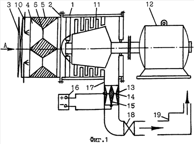 Для пуска генератора в работу включают привод 12, который вращает вал компрессора 11, и на электроды 14 и 15 электролизера 13 подают постоянный электрический ток от источника питания 16. Работой компрессора 11 на его герметизированном крышкой 2 входе создается разрежение, благодаря чему производится регулируемый жалюзи 3 забор атмосферного воздуха в корпус 1 через выполненный на крышке 2, например кольцевой канал 4 с кольцевым кавитатором 5, например местное кольцевое сужение 6. В поток забираемого воздуха форсункой 10 с кавитатором (не показано) подают и распыляют электролит, например водный раствор едкого калия. За счет кавитации в кавитаторе форсунки 10 электролит частично диссоциирует, ионизируется, капельки его тончайше распыляются и смешиваются с воздухом. Затем эта смесь проходит через кольцевой кавитатор 5 и опять же за счет кавитации происходит дальнейшее до неопасного для работы компрессора 11 предела разложение воды, ее ионизация и распыление капелек. Далее за счет разрежения в корпусе 1 электролит превращается в пар. Затем эта смесь компрессором 11 сжимается и подается в патрубок 17 для вывода газовой смеси и прогоняется через местное кольцевое сужение 14, образованное центральным телом 15 электролизера 13, где за счет кавитации и за счет протекания постоянного тока через электролит, частично уже диссоциированный в кавитаторе форсунки 10 и в кавитаторе 5, водяной пар полностью разлагается на водород и кислород, чем достигается высокая экономичность и производительность устройства. Затем газовая смесь через отсекатель 18, например обратный клапан, подается к потребителю 19, например в топочную камеру котельной установки.и сжигается.