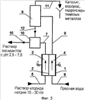 Католит в виде газожидкостной смеси по линии 8 поступает в сепаратор 9, из верхней части которого по линии 11 выводится электролизный газ – преимущественно водород – и увлеченный им шлам, образовавшийся в результате увеличения значения рН католита в процессе электролиза. В зависимости от расхода по линии 11 может быть выведена из процесса обработки и часть католита. После удаления газа и шлама католит по линии 12 поступает в узел смешения 10. Вывод из процесса части католита может быть осуществлен за счет поддержания уровня католита в сепараторе 9 или путем регулирования количества выводимого католита по линии 12 с помощью приспособлений, установленных на этой линии (не показаны). В узле смешения 10 католит смешивается в продуктами анодного окисления и в виде водного раствора по линии 15 направляется потребителю.