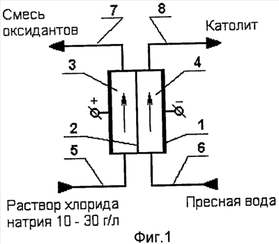 Установка для осуществления способа (фиг.1) содержит электрохимический реактор 1, выполненный из одной или нескольких электрохимических модульных ячеек, соединенных параллельно. Электрохимические ячейки разделены диафрагмой 2 на анодную 3 и катодную 4 камеры. Вход анодной камеры 3 соединен с линией подачи исходного раствора 5. Вход катодной камеры 4 соединен с линией подачи пресной воды 6. Выход анодной камеры 3 соединен с линией отвода смеси оксидантов 7, а выход катодной камеры 4 соединен линией отвода католита 8.