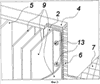 Крепление пластинчатых ребер к продольным и торцевым стенкам 2 металлической ванны можно реализовать с помощью болтового и/или заклепочного соединения 13, предварительно обеспечив ровную поверхность стенки металлической ванны путем фрезеровки или установки прокладки, например из легкоплавкого теплопроводящего материала, термопасты на основе графита или серебра, алюминиевой фольги, огнеупорного цемента и т.д., которые позволят выровнять неровную поверхность стенки.