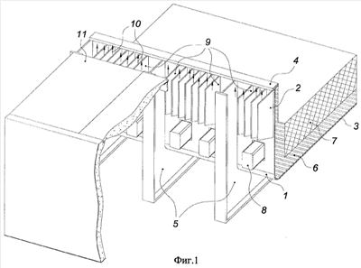 Поток воздуха 10 в промежутке ограниченном силовыми элементами 5, продольными и торцевыми стенками 2 и плитами перекрытия 11 проходит через пластинчатые ребра 9, обеспечивается подъемной (Архимедовой) силой из-за нагрева его в межреберном пространстве, а также перетеканием воздуха за счет разности его температуры по высоте стенок ванны 2. Как и в прототипе, составляющие катодное устройство металлическая ванна 1 с продольными и торцевыми стенками 2, днищем 3 и фланцевым листом 4 и силовыми элементами 5 также участвуют в теплообмене.