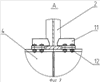 На точки опоры фундамента, выставленные по высоте, устанавливают крайнюю секцию 3. При этом между площадками 10 и фундаментом не должно быть зазора. Аналогично устанавливается другая крайняя секция. Затем на средние точки опоры фундамента устанавливают среднюю секцию 4. Разрыв между секциями и количество средних секций зависят от длины катодного устройства. На крайние секции 3 и среднюю 4 монтируется катодный кожух металлический 1 так, чтоб совпали места узлов крепления средней секции с опорными элементами 2. Катодный кожух металлический может быть зафутерован до монтажа или после монтажа на секции. Зазоры между опорными элементами и секциями устраняются металлическими прокладками после футеровочных работ. По окончании устранения зазоров устанавливают узлы крепления средней секции планки 11 и крепление 12.
