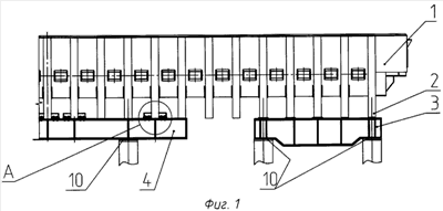 На чертежах приводится предлагаемое катодное устройство, где на фиг.1 изображена половина катодного кожуха, установленная на промежуточные опорные рамы, на фиг.2 – вид сверху промежуточных опорных рам, на фиг.3 – узел крепления средней секции.