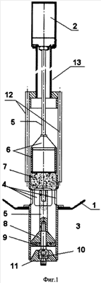 Дозируемый материал постоянно заполняет пространство в зоне загрузочных окон 4 дозировочной камеры 3. В исходном состоянии шток 5 находится в верхнем положении, верхний запорный элемент располагается над верхней кромкой загрузочных окон 4, причем рассекатель 6 находится в слое сыпучего материала, а верхние цилиндрические щетки 7 – в верхней части дозировочной камеры, выпускное отверстие нижней части дозировочной камеры 3 закрыто конической крышкой 11, нижний конусный клапан 8 с нижней цилиндрической щеткой 9 находятся в максимально высокой позиции над выпускным отверстием дозировочной камеры. Расстояние от основания нижнего конусного клапана 8 (где этот клапан контактирует с нижней цилиндрической щеткой 9) до нижнего среза дозировочной камеры не менее высоты загрузочных окон 4. Дозируемый материал из бункера 1 заполняет нижнюю часть дозировочной камеры 3 через загрузочные окна 4. Для разгрузки дозировочной камеры 3 подается управляющий сигнал на пневмоцилиндр 2, приводящий к перемещению вниз шток 5 с насаженными на него верхним запорным элементом (рассекатель 6 и цилиндрические щетки 7), нижним конусным клапаном 8 с присоединенной к нему нижней цилиндрической щеткой 9 и далее через карданный шарнир 10 на коническую крышку 11. При этом загрузочные окна 4 закрываются верхним запорным элементом (6 и 7), а сыпучий материал через выпускное отверстие нижней части дозировочной камеры 3 и далее через течку высыпается в лунку глиноземно-электролитной корки. Нижний конусный клапан 8 с присоединенной к нему нижней цилиндрической щеткой 9 проходит нижний срез дозировочной камеры 3 в момент, когда загрузочные окна 4 уже полностью перекрыты верхним запорным элементом (6 и 7). При этом отсутствует характерный для прототипа сквозной проход для сыпучего материала от бункера 1 через дозировочную камеру 3 и через выпускное отверстие в электролит ванны. Величина хода штока 5 выбрана такой, чтобы в нижнем положении штока 5 нижний конусный клапан 8 был на расстоянии от среза дозировочной камеры достаточном для полного опорожнения дозировочной камеры 3. Далее шток 5 начинает возвращаться вверх, при этом основание нижнего конусного клапана 8 достигает выпускного отверстия дозировочной камеры раньше, чем начинается открытие загрузочных окон 4. Это исключает прямой проход для сыпучего материала через загрузочные окна 4 и выпускное отверстие дозировочной камеры. Далее по мере приближения штока 5 к крайней верхней позиции коническая крышка 11 мягко самоустанавливается на фаску нижнего среза дозировочной камеры, не допуская деформации самой крышки и контактирующей поверхности дозировочной камеры.
