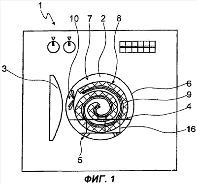 В положении, изображенном на фиг.2, держатель 8 имеет такую в основном искривленную форму, что перекрывающиеся участки высушиваемого текстильного изделия 9 отстоят друг от друга в радиальном направлении, т.е. разделены между собой промежутками. Держатель 8 в данном случае может продуваться сушильным воздухом, а также насыщенным влагой отходящим воздухом, так что сушильный воздух, выходя из держателя 8, будет воздействовать на высушиваемый материал также в области прилегания высушиваемого материала 9 к держателю 8. Далее, при исполнении держателя 8, в котором он может пропускать воздух и влагу, имеется возможность, чтобы насыщенный влагой отходящий воздух направлялся от высушиваемого материала 9 к держателю 8 внутрь барабана 2, а оттуда через дверцу в направлении конденсатора.