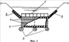 При прохождении паводковых или селевых оттоков наибольшие гидродинамические нагрузки воспринимают габионы 4 и арматурные каркасы 1 и 5. При этом габионы 4 получают небольшие перемещения, натягиваются анкера 2 и решетки каркасов 1 и 5, происходит частичное гашение избыточной энергии потоков. В арматурный решетчатый каркас 5, расположенный сверху гребня запруды, застревают камни, хворост, трава, кустарники и др. плавающие тела. В результате образуется защитный слой для металлической сетки габионов 4. Образовавшийся сверху габионов 4 в решетчатом каркасе 5 слой из камня и плавника предотвращает возможное разрушение габионной сетки под абразивным и ударным воздействием твердых частиц (наносов) потоков. Каменные наброски 6 и 7 в понурной части и на дне нижнего бьефа предотвращают образование опасных ям размыва около запруды. Для этого верхняя часть наброски должна быть уложена неразмываемыми валунами. И глубина залегания анкеров 2 должна быть ниже возможной максимальной глубины размыва русла.