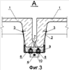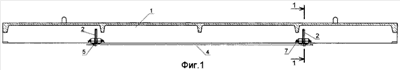 Сущность изобретения поясняется чертежами, где на фиг.1 изображена схема устройства, смонтированного на продольном ребре усиливаемой плиты, на фиг.2 – разрез 1-1 по фиг.1 и на фиг.3 – узел А на фиг.2.