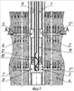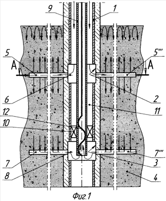 Далее в обсадную колонну 1 спускают технологическую колонну труб 9 и устанавливают пакер 10 между рядами 6 и 8 технологических каналов 5; 5 ; 5 ; 5  …5n и 7; 7 ; 7 ; 7  …7n соответственно в межтрубном пространстве 11 между обсадной колонной 1 и технологической колонной труб 9.
