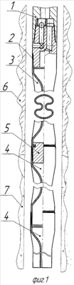 На бурильных трубах (не показана) спускают компоновку, состоящую из посадочной головки 1 (фиг.1), которая левой резьбой 2 соединена с верхней секцией 3 перекрывателя, а другой конец посадочной головки 1 соединен с колонной бурильных труб (не показана). В месте соединения верхней секции 3 перекрывателя с последующими секциями 4 установлена разрушаемая герметизирующая пробка 5. Верхнюю секцию 3 спускают в зону устойчивых пород 6, а последующие секции 4 спускают в зону осложнения 7, которую необходимо ликвидировать.