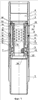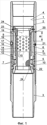 В верхней части дифференциальная втулка 6 образует совместно с расточкой 5 верхней секции 2 замкнутую кольцевую полость 19, гидравлически сообщающуюся отверстием 20 со стволом скважины (не показан) и заполняемую перед спуском в скважину гелем с плотностью, превышающей плотность раствора в скважине. Фиксация дифференциальной втулки 6 в корпусе 1 в исходном положении осуществляется срезным штифтом 21. Циркуляционные отверстия 15 перекрыты фильтром 22, который выполнен, например, в виде сетчатого проволочного кольца, установленным в проходном отверстии 23 клапана 9, и закреплен гайками 24.