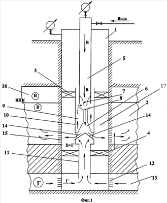 Согласно предлагаемому способу по данному варианту, в скважине 1, предназначенной для закачки водогазовой смеси в водонасыщенный объем 2, расположенный ниже ВНК, устанавливают разобщающие устройства-пакеры: верхнее 3 – выше интервала закачки водогазовой смеси, и нижнее 4 – ниже интервала закачки водогазовой смеси. В интервале между этими разобщающими устройствами-пакерами на колонне лифтовых труб 5 устанавливают жидкостно-газовый эжектор 6, рабочее высоконапорное – активное сопло 7 гидравлически сообщено с внутренней полостью колонны лифтовых труб 5, а камеру низкого давления 8 через полость 9, образованную между наружными стенками эжектора 6 и внутренними стенками патрубка 10, сообщают с хвостовиком 11, нижний конец которого сообщают через перфорационные отверстия 12 с газовым пластом 13. Жидкостно-газовый эжектор 6 снабжен двумя расположенными диаметрально-противоположно выкидами 14, имеющими гидравлическую связь через перфорационные отверстия 15 с водонасыщенным объемом 2, расположенным под нефтяной залежью 16.