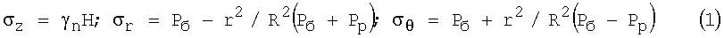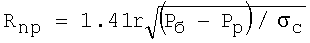 следует, что кольцевые напряжения имеют наибольшее значение на контуре ствола и по мере удаления от скважины уменьшаются до величины напряжения в нетронутом горном массиве; радиальные напряжения по мере удаления от скважины увеличиваются от значений на контуре ствола, равных давлению столба промывочной жидкости, до величины напряжения в нетронутом горном массиве. Разность между главными напряжениями  является максимальной на контуре ствола скважины, и когда действующие напряжения превысят предел прочности соли, деформация примет характер пластического течения, образуя некоторую предельную область (а), которая начинается со стенок скважины (фиг.1). Радиус предельной области Rnp в массиве соли (б) соответствует границе, при которой разность между главными напряжениями из системы уравнений (1) будет равна пределу текучести соли: