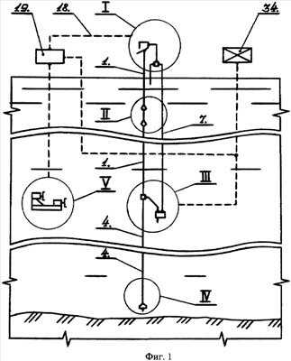 После снижения уровня воды в отдельном аккумуляторе 13 ниже сигнализатора верхнего уровня жидкости 27 блок управления 34 частично открывает управляемую задвижку 29. Уровень погружения отдельного аккумулятора 13 находится ниже, чем уровень погружения смесителя 9 подъемной трубы 1 (см. фиг.4), и после частичного открытия управляемой задвижки 29 аккумулируемый в отдельном аккумуляторе 13 сжатый воздух под действием силы Архимеда через нагнетательный трубопровод 7 и смеситель 9 поступает в поток гидросмеси подъемной трубы 1.