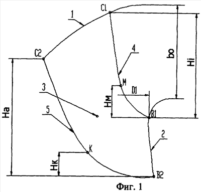 Ниже приведены фигуры 1-6, поясняющие сущность предлагаемого изобретения. Устройство лопаточного аппарата рабочего колеса радиально-осевой гидротурбины состоит из следующих элементов: на фигуре 1 показана меридианная проекция рабочего колеса, где изображены обод 1, ступица 2, перо одной из лопастей 3, соединенное с ободом и ступицей. Каждая лопасть имеет входную 4 и выходную 5 кромки. Перо лопасти 3 характеризуется тем, что участок входной кромки между точкой присоединения пера лопасти к ступице C1 и некоторой максимально удаленной против направления вращения от параллельной оси вращения колеса плоскости А-А, проходящей через точки присоединения входной кромки к ободу и ступице (соответственно точки B1 и C1), точкой М имеет наклон от ступицы к ободу против направления вращения.