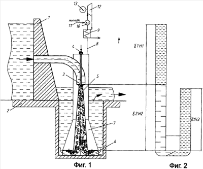 Изотермический компрессор (фиг.1) работает следующим образом: вода из водохранилища по трубопроводу поступает к смесителю 3, в котором за счет локального сужения проходного сечения скорость потока воды возрастает, давление снижается до атмосферного и в поток вводится воздух. Воздух подается вентилятором 4, обеспечивающим заданный расход, использование добавочного вентилятора позволяет выровнять скорости воды и вдуваемого воздуха, что снижает потери смешивания. Расход энергии на привод вентилятора минимален, так как требуемый напор близок к нулю.