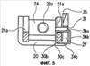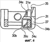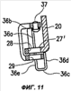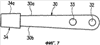 На свободном конце пластинчатой пружины вдоль ее верхней кромки 30а имеется выполненная заодно с пружиной защелка 34. По существу горизонтальная часть 34а защелки проходит по существу под углом 90° к основной плоскости пружины и над стороной 21а рычага 21 (фиг.4 и 5) с выступом за эту сторону на расстояние, равное или несколько большее ширины стороны 21а. Свободный конец горизонтальной части 34а отогнут вниз для образования по существу вертикальной части 34b и дополнительно загнут внутрь для образования нижней по существу горизонтальной части 34с, проходящей под стороной 21а. Как видно на фиг.5, свободная кромка 30с нижней горизонтальной части 34с оставляет небольшое пространство для нижней кромки 30b пластинчатой пружины, меньшее, чем ширина стороны 21а.