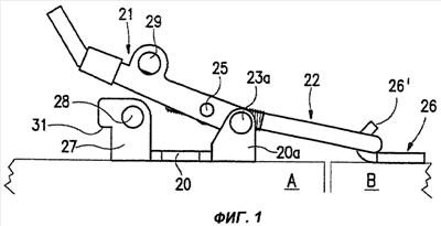 Для того, чтобы освободить рычаг 21, защелку 34 отжимают влево на фиг.5, чтобы упруго сдвинуть ее горизонтальную часть 34а из положения под контактной поверхностью 31а. В положении защелки по фиг.6, в котором ее вертикальная часть 34b примыкает к наружной поверхности стороны 21а, рычаг освобожден и может быть открыт, после чего пластинчатая пружина снова занимает ненагруженное положение вдоль стороны 21а. При следующем закрытии скошенная снятием фаски поверхность 35 кронштейна 27 взаимодействует с нижней горизонтальной частью 34с и вынуждает пластинчатую пружину отгибаться внутрь до тех пор, пока верхняя горизонтальная часть 34а не займет положение, непосредственно предшествующее положению по фиг.6, после чего она освобождается для перехода в ненагруженное положение фиксации. Движения пластинчатой пружины направляются верхней и нижней горизонтальными частями 34а, 34с, которые скользят соответственно по верхней и нижней поверхностям стороны 21а.