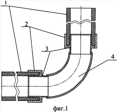 На фиг.1 изображен продольный разрез предлагаемого фитинга, металлический корпус которого изогнут под углом 90°.