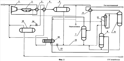 Для предотвращения гидратообразования в трубопроводы на входе в теплообменники 3, 5, испаритель-сепаратор 10 и трехпоточную вихревую трубу 11 подается метанол.
