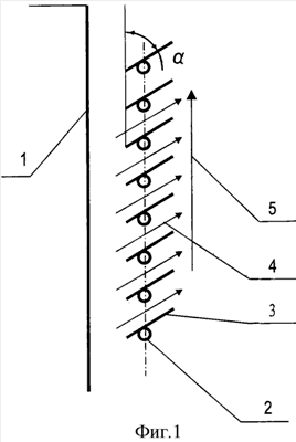 Следует отметить, что наличие наклона полосок – очень существенный признак изобретения, причем наклон должен быть выполнен именно в указанную на фиг.1 сторону, либо расположение пластинок вертикально либо горизонтально сразу же нарушает условия теплового насоса и сразу же образуется зона конвективного нагрева задней стенки.