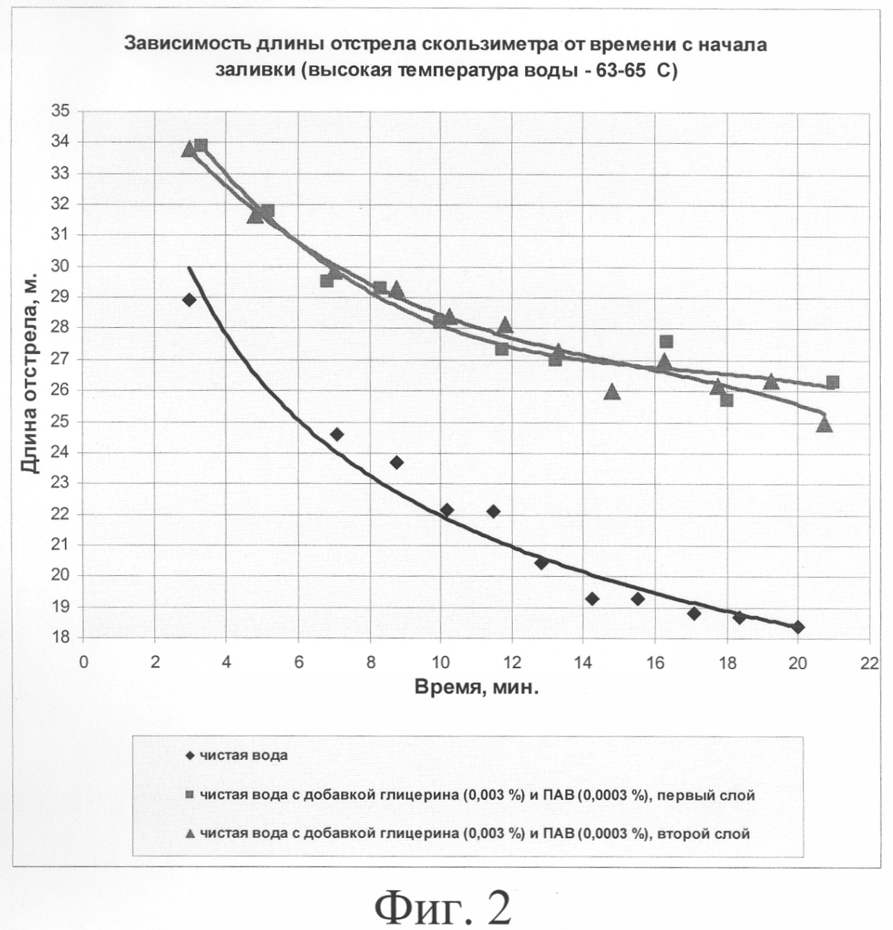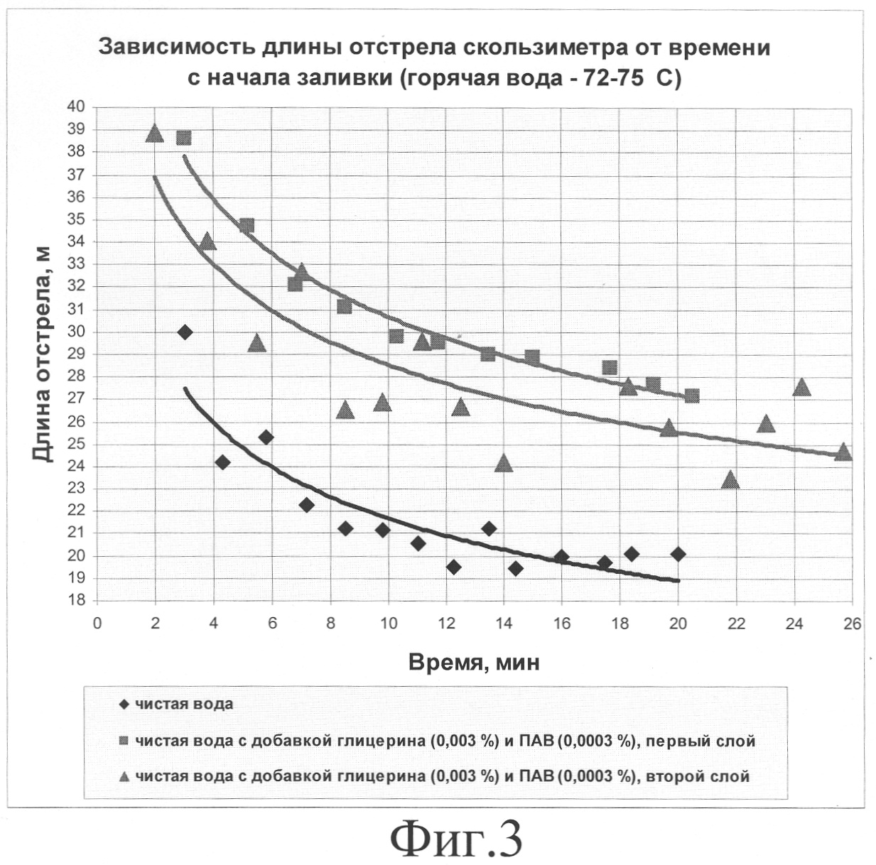 На Фиг.3 представлена диаграмма, показывающая улучшение скоростных качеств льда при заливке двух слоев льда с добавками при температуре заливаемой воды от 25 до 34°С с увеличенным содержанием ПАВ по сравнению с ПАВ, примененным на Фиг.2.