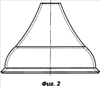 Вариант 2 кумулятивной облицовки сложной геометрической формы отличается от варианта 1 кумулятивной облицовки сложной геометрической формы выполнением края облицовки сложной геометрической формы в виде усеченного конуса с углом между образующими поверхности усеченного конуса порядка 90° (фиг.1, 2).