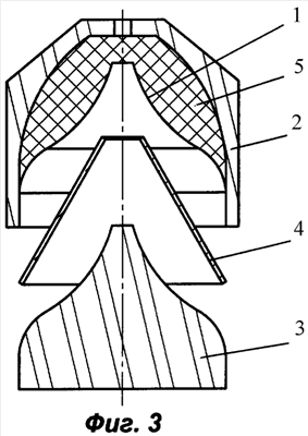 Прессование предварительное и после досылки кумулятивной облицовки 4 простой геометрической формы досылочным пуансоном 3 осуществляют на гидравлических прессах, которые выполнены во взрывобезопасном исполнении с усилием100 тс, 250 тс или 400 тс.