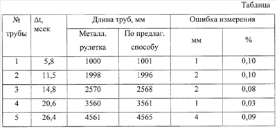 Пример. Предлагаемый способ измерения длины труб был опробован на трубах из стали 20 с внутренним диаметром 64 мм. Измерения проводили в помещении при температуре 26°С. Скорость звука V в воздухе при этой температуре равна 346 м/сек. Фиксировали временной интервал t между пиком с максимальной амплитудой в первом эхо-импульсе и пиком с максимальной амплитудой, но противоположной полярности в следующем эхо-импульсе. По измеренному t длину трубы L определяли по формуле L=V· t/2. Результаты измерений приведены в таблице.