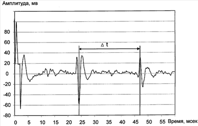 На чертеже представлена запись акустического сигнала с двумя эхо-импульсами, снятого на трубе из стали 20 с внутренним диаметром 64 мм, длиной 356 см, и показана схема измерения промежутка времени t между двумя пиками с максимальной амплитудой в первом и втором эхо-импульсах. Эти импульсы противоположны по фазе, поскольку первый эхо-импульс, пришедший к приемнику сигнала, отражается от него с потерей полуволны (скачком фазы на 180°), как от среды с более высокой плотностью (А.И.Китайгородский. Введение в физику, Физматгиз, 1959, стр.123), а от открытого конца трубы эхо-импульсы отражаются без потери полуволны.