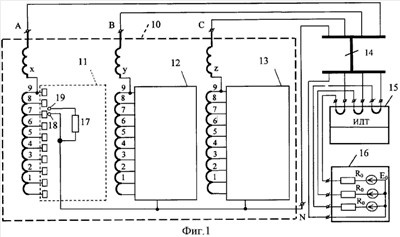 1-9 номера ответвлений переключателя; 10 – силовой трансформатор; 11÷13 РПН фаз «А»; «В»; «С» соответственно, где 17 – токоограничивающее сопротивление; 18 – главный контакт; 19 – дугогасительный контакт; 14 – четырехпроводный кабель; 15 – цифровой регистратор, где ИДТ – измерительные датчики тока; 16 – трехканальный источник постоянного напряжения.