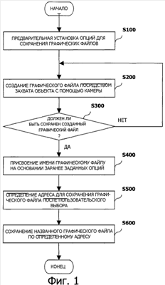 Сначала терминал мобильной связи задает опции для сохранения графических файлов, созданных посредством захвата объекта с помощью камеры (S100). А именно, терминал мобильной связи может задавать одну или более опций для присвоения имени графическому файлу после пользовательского выбора, а также может задавать адрес для сохранения графического файла в качестве значения «по умолчанию».