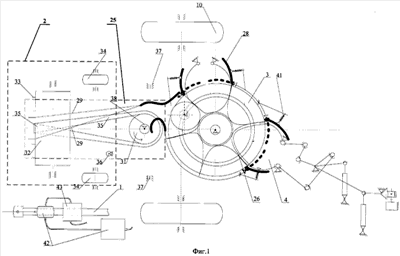 Для осуществления вращения диска 18 и днища 17 используются гидромоторы 39 и 40.