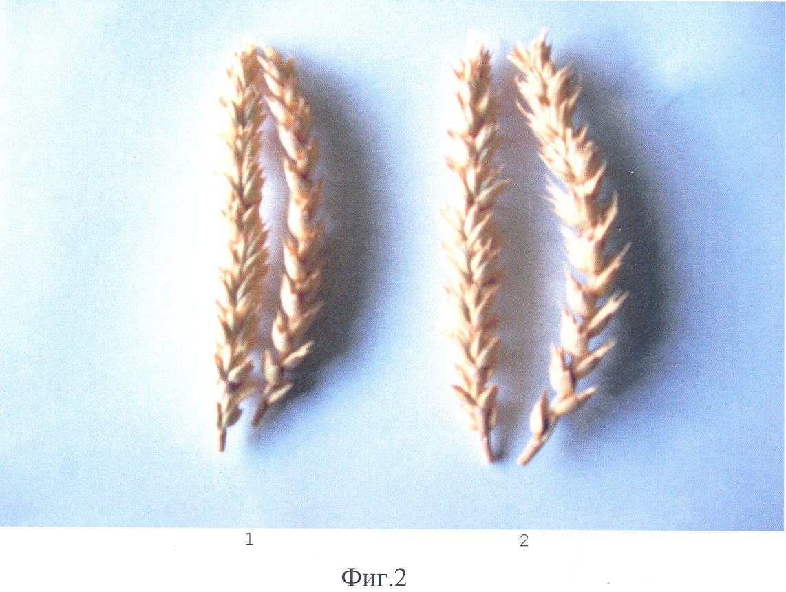 На фиг.2 представлено изображение рыхлых удлиненных колосьев без удвоенных колосков, где 1 – сорт Алем (контроль), а 2 – сорт Алем, обработанный 0,01% раствором тритона Х-100.