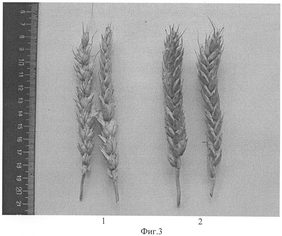 На фиг.3 представлено изображение второго поколения скверхедных колосьев с удвоенными колосками, где 1 – сорт Алем (контроль), а 2 – характерная выделенная линия 99-19.