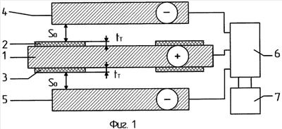 На исходную заготовку 1 накладывают или наносят трафареты 2 и 3 с заданным контуром отверстия, устанавливают с зазором S0 электроды-инструменты 4 и 5, подают в зазоры электролит и регулятором 7 включают источник тока 6, положительный полюс которого подключен к заготовке 1, а отрицательный – к электродам-инструментам 4 и 5. Время образования углублений с двух сторон, контролируемое регулятором 7, рассчитывают по количеству электричества, необходимому для удаления с заготовки 1 объема материала с получением углублений в конце первого этапа обработки.