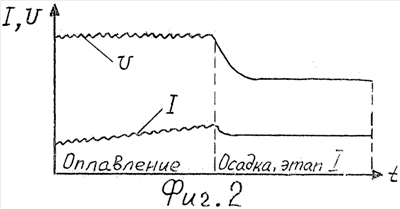 Сварка по данному способу реализуется следующим образом. В конце оплавления вычисляют среднее значение сварочного тока и используют это среднее значение сварочного тока в качестве эталонного значения для сравнения с ним текущего значения сварочного тока на первом этапе осадки. При переходе к первому этапу осадки производят снижение сварочного напряжения таким образом, чтобы это текущее значение сварочного тока стремилось к эталонному зачению в заданных пределах. В результате, как видно из диаграммы, на этапе осадки под током не происходит резкого возрастания электрической мощности, развиваемой сварочной машиной, а значит достигается поставленная цель.