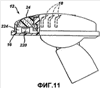 На фиг.11 показан вариант реализации кассеты, сходный с показанным на фиг.10. На фиг.11 кассета 12 включает в себя полосовую пружину 220, расположенную в полости 224, находящейся в корпусе 16 под элементом шелушения 24. Однако на фиг.11 элемент шелушения 24 размещается позади лезвий 18, так что, когда пользователь бреется бритвой, кожа пользователя обычно войдет в соприкосновение с лезвиями 18 до того, как войти в соприкосновение с элементом шелушения 24.
