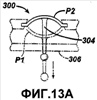 Другой вариант реализации механизма автоматического регулирования показан на фиг.13 и 13А. На фиг.13 и 13А регулировочный механизм включает в себя стержень 304. Стержень соединяется одним концом с элементом шелушения 24, который имеет форму изогнутой пластины. Своим другим концом стержень 304 проходит сквозь нижнюю поверхность 306 корпуса 16 кассеты. Когда пользователь втягивает стержень 304, элемент шелушения уходит в выемку, или положение Р1 «отключен», так что пользователь будет испытывать небольшое шелушение или совсем его не испытывать. Когда пользователь нажимает на стержень 304, элемент шелушения выступает наружу, или в положение Р2 «включен», так что пользователь будет испытывать шелушение.