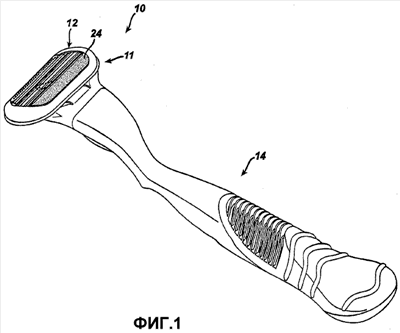 На фиг.1 и 1А показана система влажного бритья с элементом шелушения, который может регулироваться вручную. На фиг.1 и 1А система влажного бритья 10 включает в себя бреющую часть 11, прикрепленную к ручке 14. Бреющая часть 11 имеет сменную кассету 12. В то время как система влажного бритья 10, показанная на фиг.1 и 1А, включает в себя сменную кассету, в некоторых вариантах реализации она может включать в себя бреющую головку, образующую одно целое с ручкой 14, так что после того, как лезвие или лезвия затупятся, выбрасывают всю бритву как одно целое.