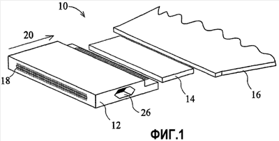 Обращаясь сначала к фиг.1, можно видеть, что печатающая головка 10 струей чернил по сигналу запроса включает корпусную конструкцию 12, запускающее устройство 14 интегральной схемы и печатную плату 16. Корпусная конструкция 12 образована со множеством параллельных каналов 18 для чернил, которые простираются в направлении, показанном стрелкой 20. Плата 22 сопел (см. фиг.2) закреплена на передней кромке корпусной конструкции 12 и определяет для каждого канала 18 сопло 24 для выброса чернил. Каждый канал 18 простирается от соответствующего сопла 24 к коллектору 26 для подачи или удаления чернил, который проходит через корпусную конструкцию 12 в направлении, перпендикулярном направлению 20, указанному стрелкой.