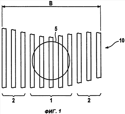 На фиг.1 схематично изображена лента 10 ремня безопасности шириной В, причем по краям, разумеется, только в символически указанном количестве проложены нити основы 2, имеющие определенную растяжимость, тогда как в средней части, которая выделена для примера, проложены нити основы 1, имеющие большую растяжимость, чем нити основы 2. Изображенный на фиг.1 короткий отрезок предлагаемой изобретением ленты 10 ремня безопасности имеет выбранную для примера широкую среднюю часть, в которой проложены нити основы 1 с большей растяжимостью. Разумеется, это изображение сильно увеличено только из соображений наглядности. На самом деле соответствующая лента ремня безопасности содержит сотни нитей основы по ширине ремня В, которые в действительности много тоньше, чем изображенные нити основы 1 и 2. Для указания возможного места прикрепления какого-либо предмета в середине ленты 10 ремня безопасности изображен круг, обозначенный цифрой 5. Само собой понятно, что и это указание имеет чисто качественный характер.