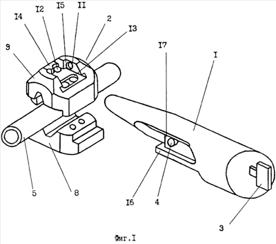 Пример реализации. Противоугонное устройство КИЛОК содержит блокирующий штырь 1 из титана длиной 180 мм с диаметром торцевой части 38 мм. Муфта 2 имеет диаметр 57 мм. Ограничительные буртики 14, 15 и уступы 16, 17 выполнены высотой 3 мм. Вес устройства в сборе составляет 1 кг. Наличие таких ограничительных буртиков 14, 15 и уступов 16, 17 делает практически невозможным криминальный доступ к рабочим частям стопоров 4, 6.