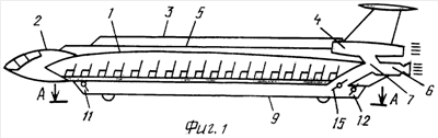 Самолет увеличивает скорость, и за счет скоростного воздушного потока на верхней плоскости плоского фюзеляжа 1 понижается давление, увеличивается его подъемная сила, и он легко набирает высоту, не затрачивая на это энергию.