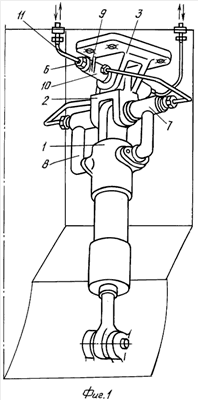 Силовой привод 1 с проушиной на торце, кардан 2 и кронштейн крепления 3, соединенные двумя осями 4 и 5, представляют собой кинематическую цепь, по которой передаются эксплуатационные усилия, поэтому гидроподвод был вынесен из зоны силового нагружения – неблагоприятного воздействия и выполнен в продлениях осей 4 и 5, соединяющих трубок 11 и поворотных звеньев 8.