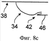 Входное средство 42 для воздуха является заборником набегающего воздуха. Это может быть, например, трубка Пито, показанная на фиг.8а, которая имеет преимущество извлечения максимального давления воздуха, входящего через указанный воздухозаборник. В качестве альтернативного решения, в зависимости от характеристик, требуемых для пропускной способности воздуха в воздушный теплообменник 40 и возможностей интеграции в обтекатель 34, этот воздухозаборник может быть типа, который извлекает меньше динамического давления, чем воздухозаборник типа трубки Пито, например, совкового типа, как показано на фиг.8b, или даже типа, встроенного в наружную поверхность 46 обтекателя 34 (например, NACA), как показано на фиг.8с.