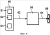 В специфичном варианте выполнения, показанном на фиг.5, охлаждающая система согласно изобретению имеет по меньшей мере один вентилятор 56. Работа этого вентилятора 56 позволяет обеспечивать и увеличивать пропускание воздуха в теплообменнике 40, в частности, когда скорость самолета равна нулю (самолет находится на земле) или же меньше заданного значения (например, в фазах взлета и посадки). Таким образом, когда охлаждающая система согласно данному изобретению имеет размеры для обеспечения охлаждения указанной жидкости в фазах полета самолета в крейсерском режиме, использование вентилятора позволяет обеспечивать охлаждение указанной жидкости во всех фазах использования самолета. Указанная охлаждающая система, содержащая один вентилятор 56, имеет преимущество меньшей массы по сравнению с охлаждающей системой, которая бы имела размеры для обеспечения охлаждения указанной жидкости без вентилятора в фазах полета самолета, соответствующих скорости меньше крейсерской скорости самолета. Кроме того, она имеет преимущество по сравнению с системой без вентилятора, состоящее в обеспечении охлаждения указанной жидкости даже когда самолет движется по земле с нулевой скоростью. Вентилятор 56 может быть расположен в зависимости от направления циркуляции воздуха по потоку перед теплообменником 40 (смотри фиг.5) или за этим теплообменником 40. Он может приводиться в действие, в частности, электрически или гидравлически. Как показано на фиг.6, этот вентилятор 58 предпочтительно соединен с помощью соединения 64 с управляющим средством 56, которое имеет по меньшей мере один вход, соединенный с набором 60 источников S1, S2, …, Sn информации с помощью по меньшей мере одного соединения 62. Эти источники информации могут быть, в частности, датчиками или компьютерами самолета. Информация, обеспечиваемая источниками S1, S2, …, Sn информации, предпочтительно соответствует, в частности, температуре жидкости, подлежащей охлаждению, и/или воздушной скорости самолета. В этом случае управляющее средство 58 останавливает работу вентилятора 56, когда температура жидкости ниже заданного значения Tmin, для того чтобы чрезмерно не охлаждать эту жидкость, или когда воздушная скорость самолета выше заданного значения Vmin, для того чтобы не перекручивать указанный вентилятор. Когда температура жидкости больше указанного заданного значения Tmin и/или когда воздушная скорость самолета меньше указанного значения Vmin, то управляющее средство 58 включает вентилятор 56 для принудительной циркуляции воздуха в теплообменнике 40. Такой режим работы имеет преимущество обеспечения достаточного охлаждения жидкости в фазах полета, отличных от фаз (соответствующих, например, фазам полета в крейсерском режиме), для которых выбраны размеры охлаждающей системы. Например, величину Vmin можно выбрать больше скорости взлета и меньше крейсерской скорости. В одном варианте выполнения управляющее средство 58 управляет вентилятором 56 с изменяемым уменьшением скорости, когда воздушная скорость самолета увеличивается, так что управление вентилятором 56 не выполняется (нулевая скорость), когда воздушная скорость самолета больше Vmin. В другом варианте выполнения управляющее средство 58 управляет вентилятором 56 в соответствии с температурой жидкости, подлежащей охлаждению, посредством включения