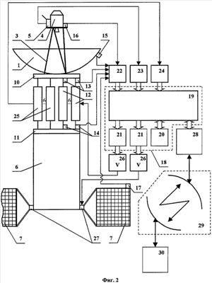 Во всех приведенных режимах сигналы от совмещенных датчиков пространственного положения и ускорений 13-17 поступают через соответствующие АЦП 22, а от звездных датчиков 5 и датчиков относительной скорости 25 – соответственно через АЦП 23 и 24, в цифровом виде в БВИИУС 18, в которой с помощью нейрокомпьютера 19 и программно-алгоритмического обеспечения 20 осуществляются обработка поступающей информации и формирование управляющих команд в реальном масштабе времени, которые через соответствующие ЦАП 21 и усилители мощности 26 поступают на исполнительные органы единичных модулей активной виброизоляции 12 и приводы поворота 27 панелей солнечных батарей 7, а также через шину выходных данных предварительно обработанные и сжатые потоки информации через бортовую радиотелеметрическую систему 28 и радиолинию 29 поступают в наземную приемно-регистрирующую систему 30, в которой операторами-исследователями производится их дальнейшая обработка и анализ полученных результатов и при необходимости корректируется программа проведения наблюдений за объектами исследований, которая в обратном порядке через радиолинию 29 и бортовую радиотелеметрическую систему 28 передается в БВИИУС 18 для выполнения.