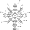 Аналогично, из фиг.5 видно, что вращающаяся внутренняя часть 21 блока 19 клапанов имеет четыре выходных отверстия 28, размещенных с одинаковым шагом по углу относительно оси А, а также четыре клапана 29, доставляющих сжатый воздух, впускаемый через входное отверстие 27, и размещенных таким же образом с одинаковым шагом в угловом направлении относительно оси А и смещенных относительно выходных отверстий 28 для текучей среды.