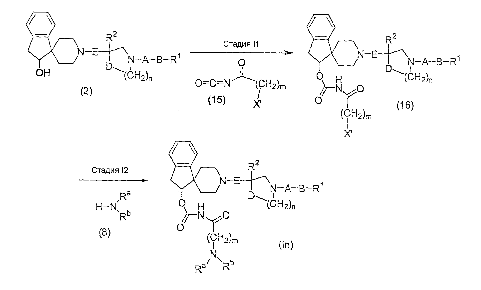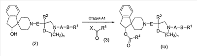 СПОСОБ ОСУЩЕСТВЛЕНИЯ ИЗОБРЕТЕНИЯ Соединение (I) по настоящему изобретению может быть получено способами, описанными ниже. Из числа соединений (I), соединение, где R3 представляет собой -CO-R4, может быть получено в соответствии со следующим способом A. <Способ A> В вышеуказанных формулах A, B, D, E, R1, R2, R4 и n являются такими же, как определено выше, и X представляет собой гидроксильную группу или удаляемую группу. Для «удаляемой группы» в определении X нет конкретных ограничений при условии, что она представляет собой удаляемую группу, которая используется в области химии органического синтеза, и представляет собой предпочтительно атом галогена, такой как атом хлора, атом брома или атом йода; низшую алкансульфонильную группу, такую как метансульфонил или этансульфонил; галоген низшую алкансульфонильную группу, такую как трифторметансульфонил или пентафторэтансульфонил; или арилсульфонильную группу, такую как бензолсульфонил, п-толуолсульфонил или п-нитробензолсульфонил, более предпочтительно атом галогена, в частности предпочтительно атом хлора или атом брома. (Стадия A1) Стадия A1 представляет собой стадию, где соединение, имеющее общую формулу (Ia), получают путем конденсации соединения (2) и соединения (3) в инертном растворителе в присутствии или в отсутствие конденсирующего агента и в присутствии или в отсутствие основания. Для использования инертного растворителя нет конкретных ограничений при условии, что он является инертным в настоящей реакции, примеры его включают алифатические углеводороды, такие как гексан, гептан, лигроин или петролейный эфир; ароматические углеводороды, такие как бензол, толуол или ксилол; галогенированные углеводороды, такие как метиленхлорид, хлороформ, тетрахлорид углерода, дихлорэтан, хлорбензол или дихлорбензол; сложные эфиры, такие как этилформиат, этилацетат, пропилацетат, бутилацетат или диэтилкарбонат; эфиры, такие как диэтиловый эфир, диизопропиловый эфир, тетрагидрофуран, диоксан, диметоксиэтан или диметиловый эфир диэтиленгликоля; кетоны, такие как ацетон, метилэтилкетон, метилизобутилкетон, изофорон или циклогексанон; нитрилы, такие как ацетонитрил или изобутилнитрил; амиды, такие как формамид, N,N-диметилформамид, N,N-диметилацетамид или гексаметилфосфортриамид; сульфоксиды, такие как диметилсульфоксид; и сульфоны, такие как сульфолан, предпочтительно галогенированные углеводороды и наиболее предпочтительно метиленхлорид. Примеры используемых «конденсирующих агентов» включают (1) сочетания сложных эфиров фосфорной кислоты, таких как диэтилфосфорилцианид или дифенилфосфорилазид, и оснований, указанных ниже; (2) карбодиимиды, такие как 1,3-дициклогексилкарбодиимид, 1,3-диизопропилкарбодиимид или 1-этил-3-(3-диметиламинопропил)карбодиимид; сочетания вышеуказанных карбодиимидов и оснований, указанных ниже; или сочетания вышеуказанных карбодиимидов и N-гидроксисоединений, таких как N-гидроксисукцинимид, 1-гидроксибензотриазол или N-гидрокси-5-норборнен-2,3-дикарбоксиимид; (3) сочетания дисульфидов, таких как 2,2′-дипиридилдисульфид или 2,2′-дибензотиазолилдисульфид, и фосфинов, таких как трифенилфосфин или трибутилфосфин; (4) карбонаты, такие как N,N’-дисукцинимидилкарбонат, ди-2-пиридилкарбонат или S,S’-бис(1-фенил-1H-тетразол-5-ил)дитиокарбонат; (5) хлориды фосфиновой кислоты, такие как N,N’